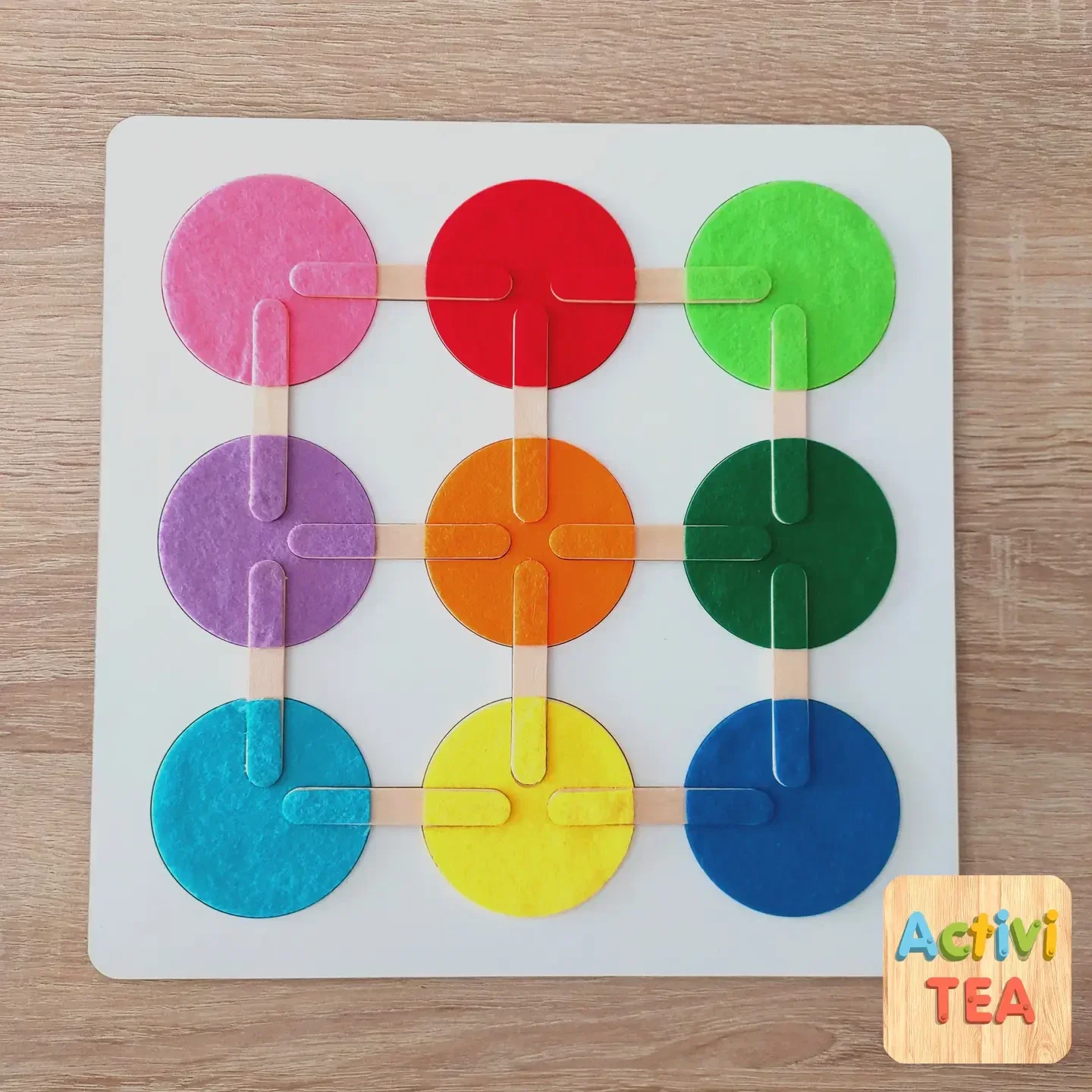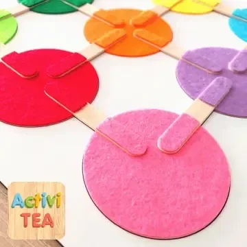 Het is een handgemaakt spel met hout en vilt. Het spel bestaat uit een set gekleurde cirkels gemaakt van vilt en houten stokjes.