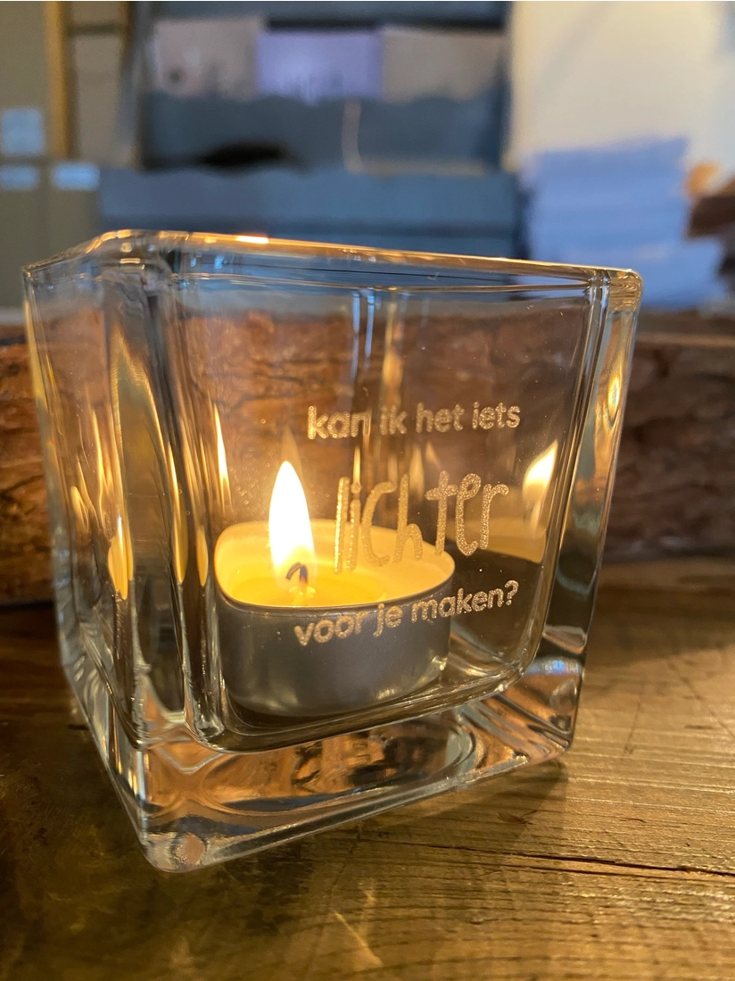 Het theelichtje wordt geleverd met een waxinelichtje met vanille geur. Het luciferdoosje met de tekst 'lichtpuntjes', maak het kadootje helemaal af.